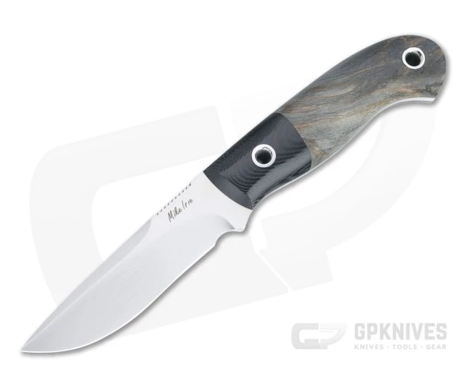 The Mike Irie Custom Model 110 lightweight hunter is an ideal size for hunting, woodcraft or daily carry or as a mid-sized fixed blade for any collection. Mike Irie is renowned for his hand ground blades, and his Custom Model 110 showcases his skill and attention to detail. This version comes with a hand rubbed satin CPM-154 stainless steel spear point blade and stabilized dyed Maple handle scales with black linen Micarta bolsters.
