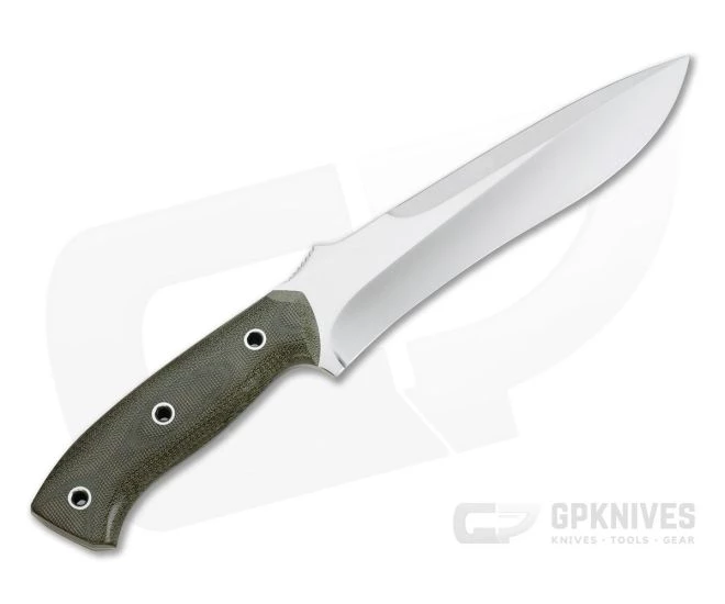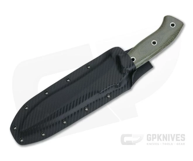 Handle: Rugged Green Canvas Micarta is contoured to create a flawless handle that is secure and comfortably ergonomic. While the polished finish does not offer much in the way of traction the thick, contoured slabs offer the ultimate comfort and a solid grip in any condition. Three stainless steel tubes attach the scales and offer multiple options for lashing or lanyard attachment.