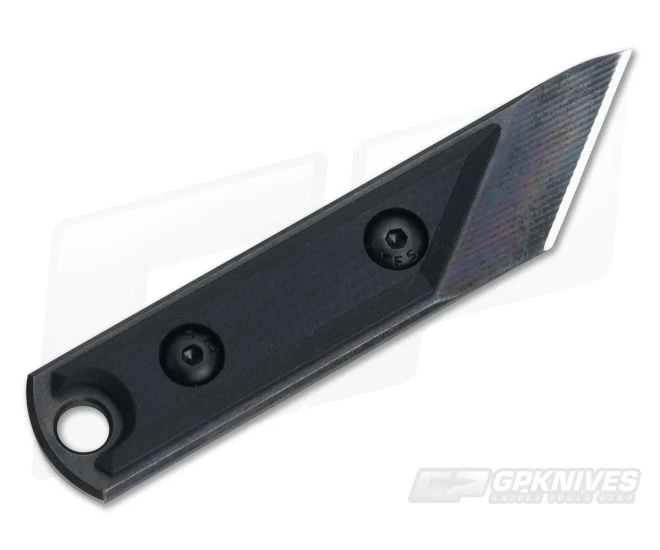 The Handle: A single solid piece of black G10 is mounted to one side of the knife with two Allen head bolts. The scale and blade tang are chamfered to offer a surprisingly comfortable and secure grip on this diminutive cutting tool.