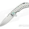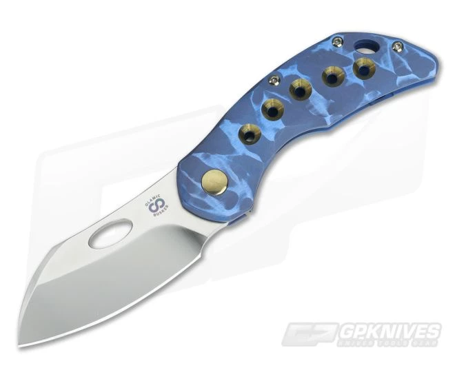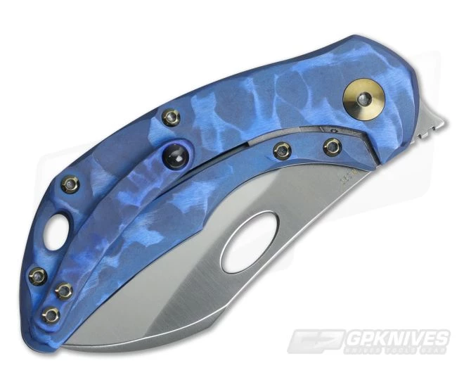 The Handle: The ergonomic handle design locks the knife into the hand in either three- or four-finger grips. The polished, bronze anodized 5 Hole pattern on the handle along with the matching titanium hardware are highlights in two-tone, “Blue Seabed” finish on the titanium handle slabs. A matching floating backspacer protects the blade in the closed position while the titanium frame lock offers safe and secure lock up during use. A steel lock face insert offers smooth operation over the life of the knife and provides over travel protection.