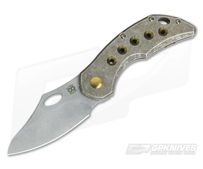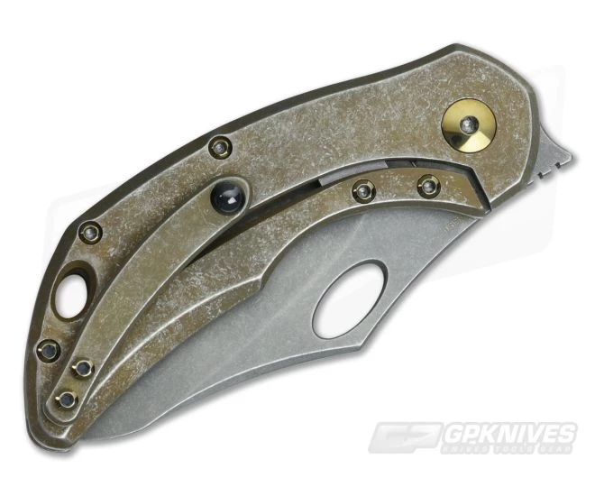 The Handle: The ergonomic handle design locks the knife into the hand in either three- or four-finger grips. The polished 5 Hole pattern on the handle along with the polished titanium hardware are highlights in the rugged bronze anodized stone wash finish on the titanium handle slabs. A matching floating backspacer protects the blade in the closed position while the titanium frame lock offers safe and secure lock up during use. A steel lock face insert offers smooth operation over the life of the knife and provides over travel protection.