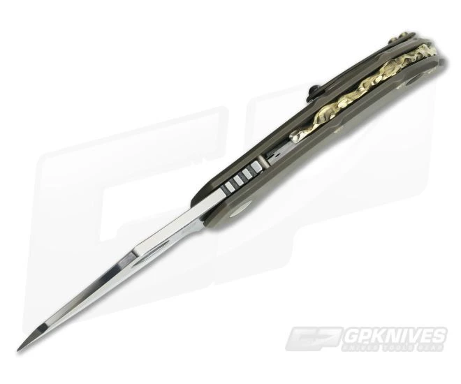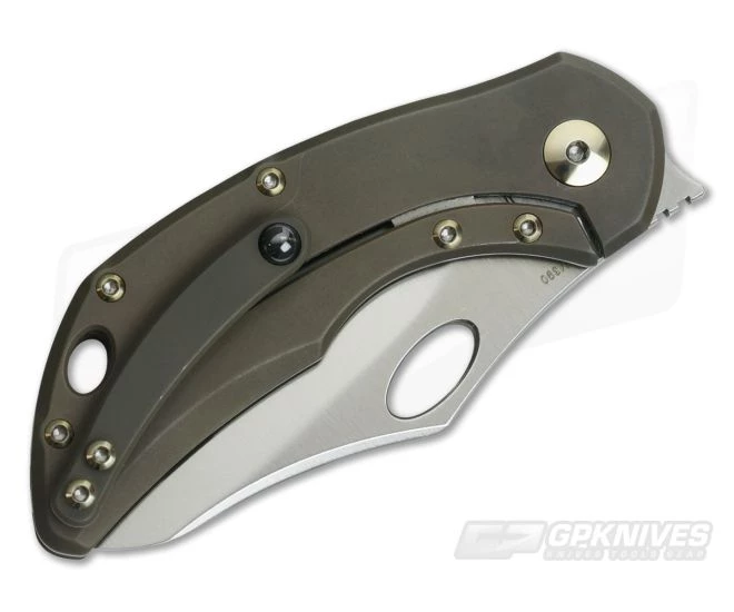 The Handle: The ergonomic handle design locks the knife into the hand in either three- or four-finger grips. A bright, bronze anodized, sculpted floating backspacer and matching titanium hardware offer highlights contrasting with the matte bronze finish on the titanium handle slabs and pocket clip. The floating backspacer protects the blade in the closed position and offers a unique visual look. The titanium frame lock offers safe and secure lock up during use. A steel lock face insert offers smooth operation over the life of the knife and provides over travel protection.