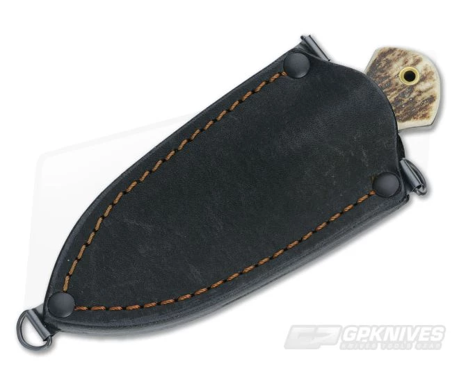 This necker is under five inches overall with full tang damascus construction. Dual edged for sharp, piercing power with pinned natural stag handle scales. Rugged, tough construction this Necker from Olamic would make an excellent companion. Includes a lanyard hole.