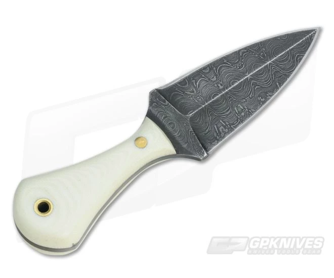 This necker is under five inches overall with full tang damascus construction. Dual edged for sharp, piercing power with pinned white g10 handle scales. Clean, tough construction this Necker from Olamic would make an excellent companion. Includes a lanyard hole.