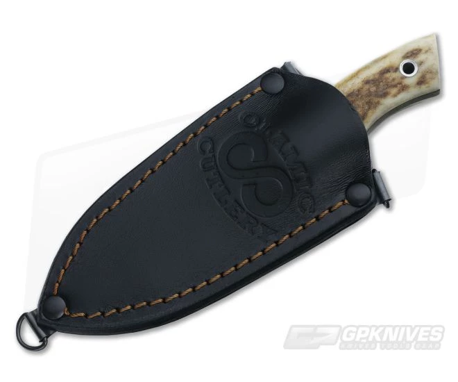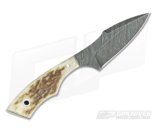 This necker is under six inches overall with full tang damascus construction. Modified spear/wharny for sharp, piercing power with pinned natural stag handle scales. Rugged, tough construction this Necker from Olamic would make an excellent companion. Includes a lanyard hole.