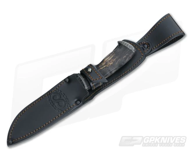 The Blade: Traditional drop point blade has been shaped from High Carbon Vanadium Damascus (HCVD) steel that utilizes Olamic’s proprietary process for excellent edge retention and ruggedness. The hidden tang marbled damascus patterned blade has been flat ground offering great slicing and utility capabilities.