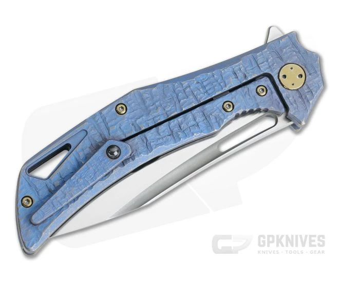 Handle: Two solid slabs of titanium form the handle in a highly comfortable and ergonomic design. All the edges are chamfered to reduce hot points with an Experimental hand texture that enhances traction while offering unprecedented style complemented with a blue over bronze anodized finish. Both the 3D machined pocket clip and floating back spacer feature the same finish as the handles. Notches on the frame lock bar makes disengagement easy while a steel insert on the lock face provides smooth operation. Inside the back spacer is marked “SWISH” and “S481” and a generous cutout near the end of the handle allows for easy lanyard attachment.