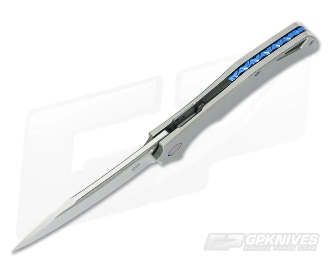 The Handle: Two solid slabs of titanium form the handle with ergo’s galore and comfort to spare. Fully contoured with soft edges continuing the “long” theme here fit for most medium to large sized palms. The matte grey finishing is super clean and ready for personalizing. It looks great with blue anodized titanium hardware to boot. We have a blue floating fileworked titanium back spacer for construction labeled “SWISH” and S047 on the inside. Notches on the frame lock bar make access fluid while a steel insert on the face creates effortless function. There is a lightening window cut out of the end near the spine that works well for personalizing with a lanyard attachment. It’s finished off with a tip up carry clip sporting a ball bearing retention accent for smooth in and out of pocket handling.