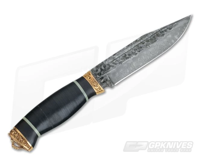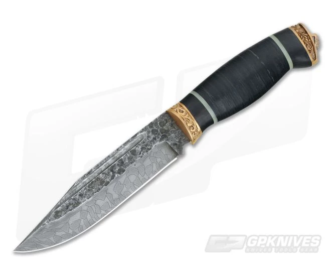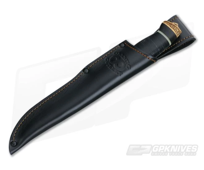 The Handle: Contoured and black stacked leather fill the palm of the knife with moonglow and Wenge Wood ring accents on each end. Cast bronze bolster and butt cap with lanyard ring on end. Well balanced and comfortable in hand.