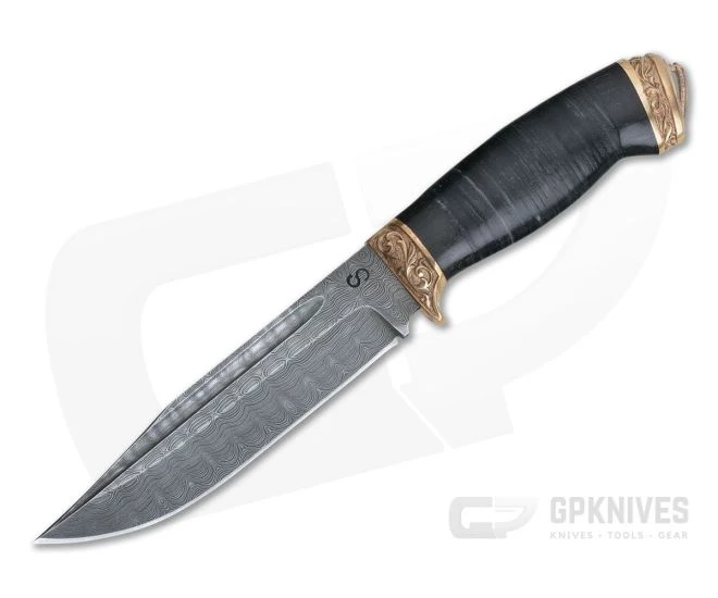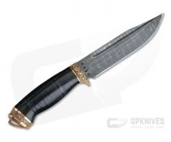Blade: The Military-inspired clip point blade is made of hand-forged and hand-shaped H.C.V. Damascus with a hollow saber grind and dual fullers for balance and performance. Hidden tang construction offers balance and strength with a sharpening relief grind for ease of maintenance. The Serial Number 4654 is stamped on back of the blade tang.