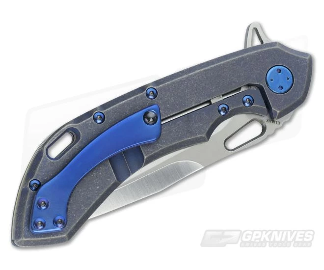 The Handle:Â Well-contoured, palm-friendly blue stonewashed titanium handle slabs have a smooth texture and hole pattern design. The titanium frame lock bar has a steel insert tab that doubles as an overtravel stop with ceramic detent ball. A floating blue titanium backspacer has WAYFARER 247 and the serial number T235 on the inside. A nice lanyard hole cutout on the humpback of the handle is included along with all-titanium hardware.