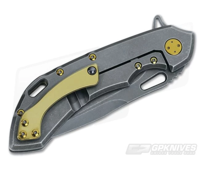 The Handle: Well-contoured, palm-friendly PVD stonewashed titanium handle slabs have a smooth texture and bronze ano-accented hole pattern design. The titanium frame lock bar has a steel insert tab that doubles as an overtravel stop with ceramic detent ball. A floating bronze titanium backspacer has WAYFARER 247 and the serial number T694 on the inside. A nice lanyard hole cutout on the humpback of the handle is included along with all-titanium hardware.