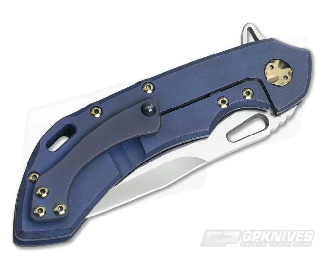 The Handle: The ergonomic handle design locks the knife into the hand for secure use and all the edges are contoured to reduce hot spots. The Kinetic Ocean finish has a brushed denim blue look with gold hole cutouts. The titanium frame lock has a steel lock face insert that holds the ceramic detent ball and has a tab that doubles as an over-travel stop. A sculpted, anodized floating titanium backspacer has “WAYFARER 247” and the serial number “T862” on the inside with custom pivot. A nice lanyard hole cutout on the humpback of the handle is included along with all-titanium gold hardware. The backspacer and hardware are anodized to match.