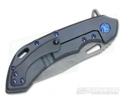 The Handle: The ergonomic handle design locks the knife into the hand for secure use and all the edges are contoured to reduce hot spots. The Kinetic Sky finish has a wire brush texture and a striking blue color. The titanium frame lock has a steel lock face insert that holds the ceramic detent ball and has a tab that doubles as an over-travel stop. A sculpted, anodized floating titanium backspacer has “WAYFARER 247” and the serial number “T917” on the inside. A nice lanyard hole cutout on the humpback of the handle is included along with all-titanium hardware. The backspacer and hardware are anodized a matching deep blue.
