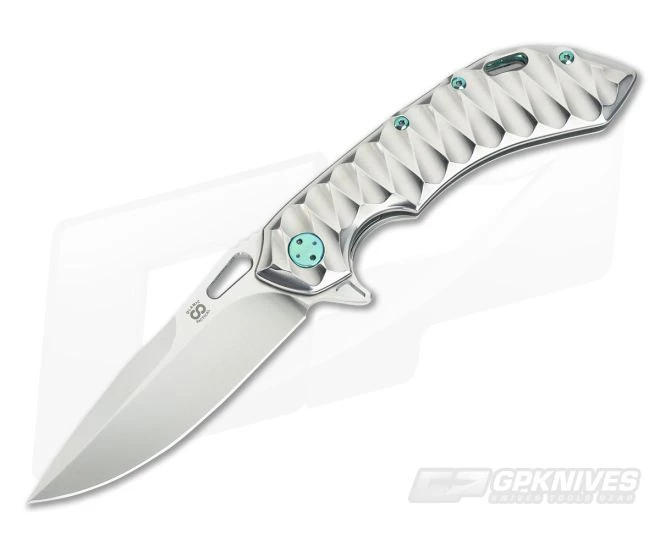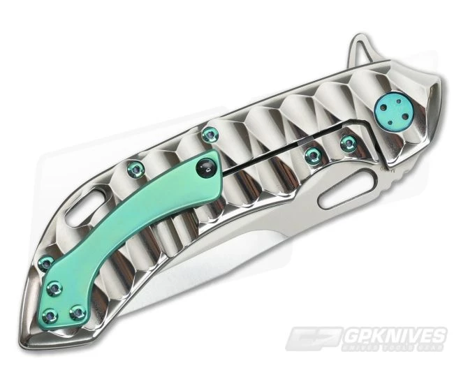 The Handle: The ergonomic handle design locks the knife into the hand for secure use and all the edges are contoured to reduce hot spots. The Scalloped texture on the handle scales is comfortable while adding traction in the hand. The handles have an eye-catching high-polish finish that set off the green anodized titanium hardware, pocket clip and “Nugget” textured floating backspacer. The titanium frame lock has a steel lock face insert that holds the ceramic detent ball and doubles as an over-travel stop. The interior of the backspacer is etched with “WAYFARER 247” and the serial number “T1003”. An oval hole cutout on the back of the handle allows for easy attachment of a lanyard.