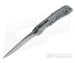 The Handle: The ergonomic handle design locks the knife into the hand for secure use and all the edges are contoured to reduce hot spots. An Acid Rain finish has multiple hole cutouts aiding in grip and make an excellent accent to the blade. The titanium frame lock has a steel lock face insert that holds the ceramic detent ball and has a tab that doubles as an over-travel stop. A darkened floating titanium backspacer has “WAYFARER 247H” and the serial number “T161H” on the inside. A nice lanyard hole cutout on the humpback of the handle is included along with all-titanium hardware. The backspacer and hardware have a dark matching finish.