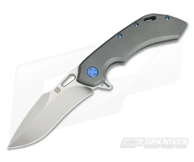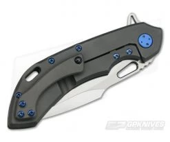 Handle: The ergonomic handle design locks the knife into the hand for secure use and all the edges are contoured to reduce hot spots. The “Darkblast” finished titanium is a simple and elegant matte grey with a very fine, subtle texture in the hand. The titanium frame lock has a steel lock face insert that holds the ceramic detent ball and has a tab that doubles as an over-travel stop. A polished, blue anodized, “Rocks” textured floating titanium backspacer has “WAYFARER 247H” and the serial number “T330H” on the inside. A nice lanyard hole cutout is included on the back of the handle along with blue anodized titanium hardware which match the backspacer.