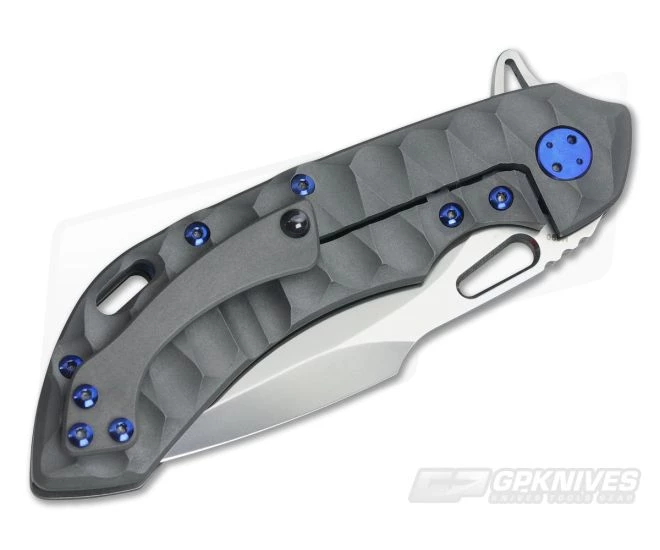 The Handle:Â The ergonomic handle design locks the knife into the hand for secure use while all the edges are contoured to reduce hot spots. The Dark Blast finish is simple and functional while the Scalloped texture provides an increase in traction while reducing weight. The titanium frame lock has a steel lock face insert that holds the ceramic detent ball and has a tab that doubles as an over-travel stop. An anodized floating titanium backspacer has “WAYFARER 247H” and the serial number “T067H” on the inside. A nice lanyard hole cutout on the humpback of the handle is included along with all-titanium hardware. The backspacer and hardware are anodized a matching vibrant blue.