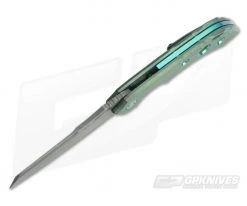 Handle: The ergonomic handle design locks the knife into the hand for secure use and all the edges are contoured to reduce hot spots. The Kinetic Rainforest finish is wire brush textured with under green anodization with bronze undertones. Green anodized 3-Hole pattern milling on the front provides added traction. The titanium frame lock has a steel lock face insert that holds the ceramic detent ball and has a tab that doubles as an over-travel stop. An anodized floating titanium backspacer has “WAYFARER 247S” and the serial number “T035S” on the inside. A lanyard hole cutout is included on the back of the handle along with matching green anodized titanium hardware.