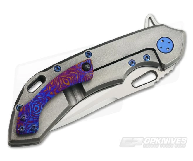 Handle: The ergonomic handle design locks the knife into the hand for secure use and all the edges are contoured to reduce hot spots. The Orange Peel finish has a subtle texture with blue 3-Hole pattern cutouts. The titanium frame lock has a steel lock face insert that holds the ceramic detent ball and has a tab that doubles as an over-travel stop. A blue anodized floating titanium backspacer has “WAYFARER 247T” and the serial number “T034T” on the inside. A nice lanyard hole cutout is included on the back of the handle along with blue anodized titanium hardware which match the milled holes.