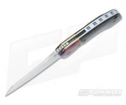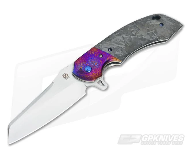 The Handle: Smooth, contoured CarbonFire marbled carbon fiber handle scales rest over thick jeweled titanium liners. They are accented by slanted Ti-Damascus bolsters for a sleek look. Solid with smooth, one-handed closing. Construction is completed with a gear pattern titanium backspacer uniquely serialized on the inside W1050 and all-titanium hardware.