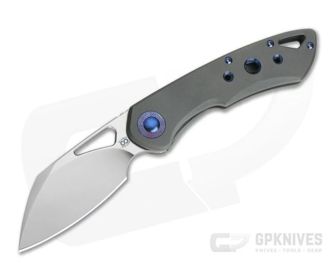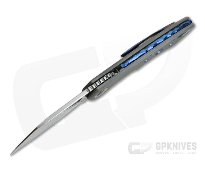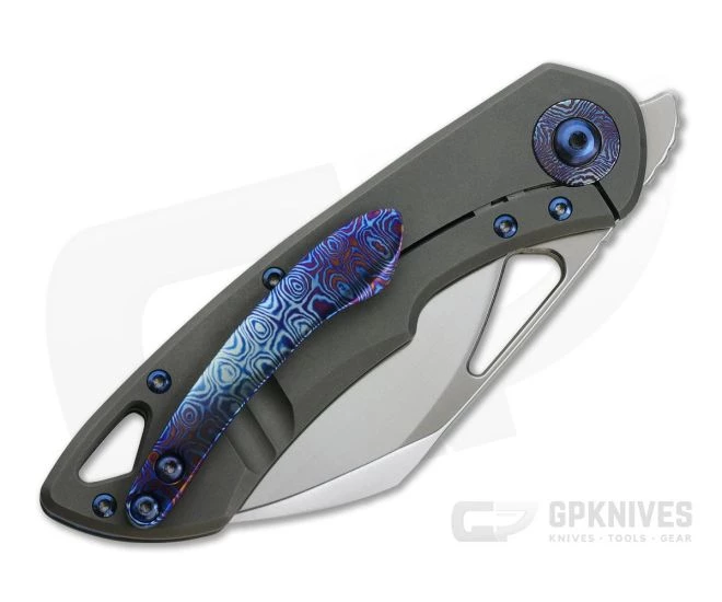 Designed by A. Kolesnikov, the Olamic Cutlery Whippersnapper is a followup to the popular Busker front flipper. Offering a more full size platform, the Whippersnapper retains the same top flipper design along with the premium materials, exceptional build quality and unique design and aesthetic for which Olamic Cutlery is known. Compact and elegant in design, the Whippersnapper is an excellent choice for everyday carry in any environment with a size that is easy to carry yet up to nearly any task. This version comes with a Satin, CPM-20CV Sheespfoot blade, Dark Blast titanium handles with Blue anodized Three Hole milling, Timascus Pivot Collars and matching clip.