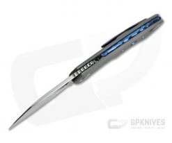 Handle: Designed with ergonomics and comfort in mind, the handle locks the knife into the hand in a solid three-finger grip or use the choil for added control and a four-finger grip. The titanium handles are finished in a Dark Blast finish that gives it a subtle texture and subdued look while the Three-Hole milling adds traction and visual contrast with a blue anodized finish. Timascus pivot collars complement the blue milled holes and hardware along with the file worked, blue anodized floating back spacer. Offering safe and secure lock up, the titanium frame lock is equipped with a steel lock face insert for smooth operation over the life of the knife.