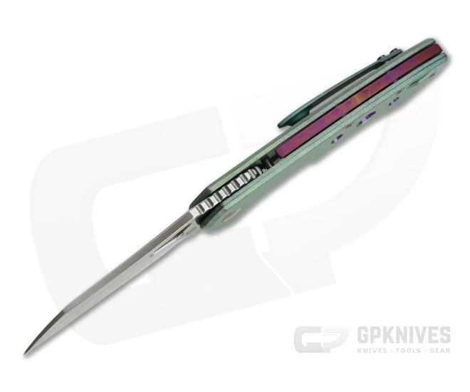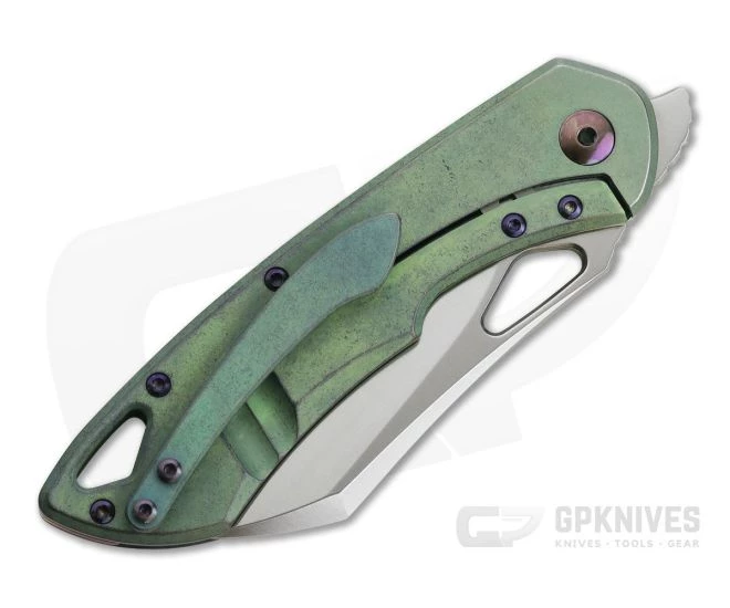 Handle: Designed with ergonomics and comfort in mind, the handle locks the knife into the hand in a solid three-finger grip or use the choil for added control and a four-finger grip. The titanium handles are finished in a tumbled Rainforest anodized finish for a striking visual appeal. Purple anodized Three Hole milling adds traction and, along with the matching hardware, complements the green of the anodized titnaium. A milled, anodized floating back spacer is file worked for an even more custom feel. Offering safe and secure lock up during use, the titanium frame lock is equipped with a steel lock face insert for smooth operation over the life of the knife.