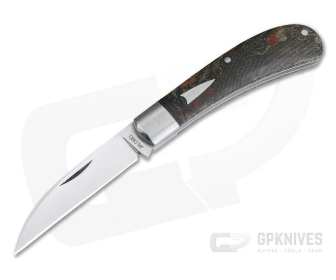 Jose “Pepe” Jalomo Jr. is a custom knife maker who has honed his skill to perfection and this custom Trapper pattern slip joint is an excellent example of it and his attention to detail. The handle is a traditional Trapper pattern with brushed stainless steel bolsters and liners and custom Crosscut Rag Micarta covers from Hansen Micarta. The blade is a beautifully satin finished Wharncliffe made from CPM-154 for modern performance.