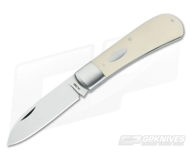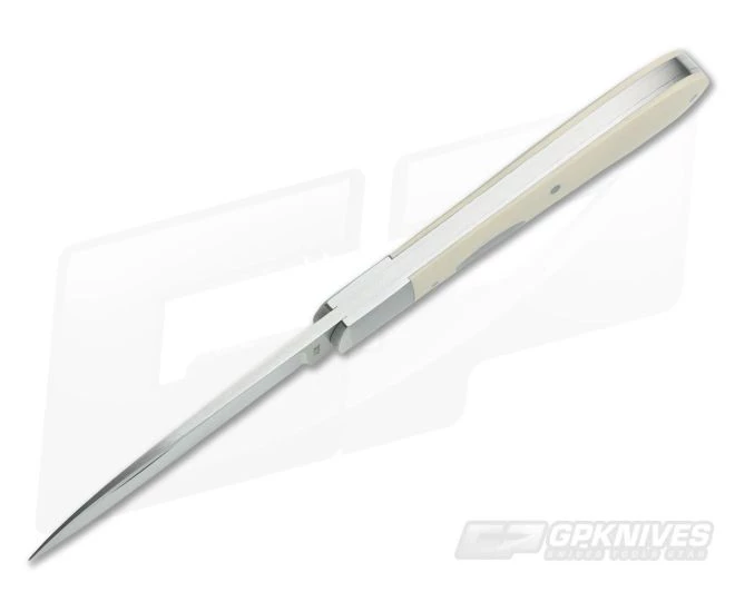 Handle: The traditional Zulu pattern is executed with brushed stainless steel liners, integral bolsters and handsome white paper Micarta covers. The smooth Micarta is elegant and stylish without being flashy. The back spring is also equipped with a hand rubbed satin finish which also matches the steel oval shield on the front cover.