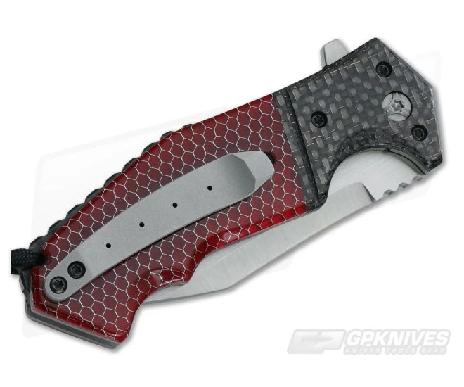 The Handle: The polished Red C-Tek™ scales have a silver honeycomb pattern throughout. They meet up with lightning strike carbon fiber bolsters that have been chamfered to remove any sharp edges and helps form the basic ergonomics of the handle. Thick titanium liners and hardware compliment the scales well and give the knife it’s strength. Fully tactical handle shape provides a place for each finger for ultimate control and a great well balanced feel in the hand. The bolsters are complimented with a carbon fiber backspacer and tip up carry titanium pocket clip.