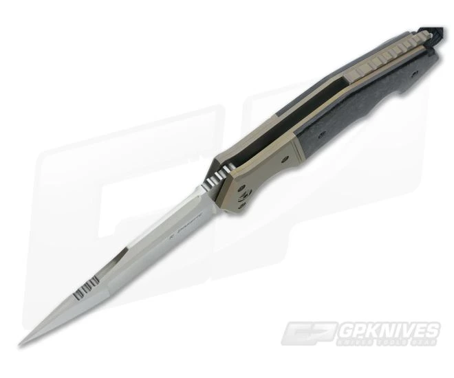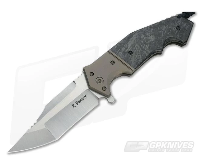 Randy Doucette Custom Oddity Bowie Flipper with a Fire Carbon Fiber/Bolstered handle and a satin finished premium CPM-10V tool steel blade. This badass bowie utilizes one of the toughest, most wear-resistant tool steels available. Balance, fit ‘n finish and blade seating are top notch Doucette. Brand new direct from maker.