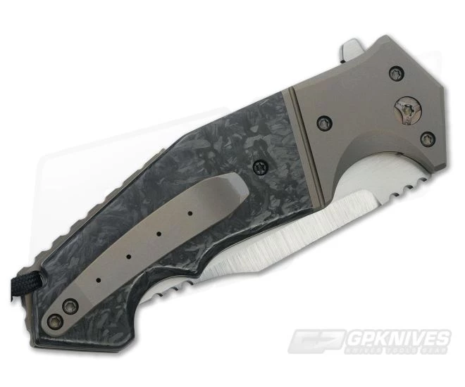 The Handle: Polished fire carbon fiber scales have an insane amount of shredded fibers jumping off the handle. They are secured via titanium hardware to the anodized titanium frame meeting flawlessly with the Ti bolster. Fully tactical handle shape is ergonomic for ultimate control in the forward or reverse grip and a great well balanced feel in hand. A treaded titanium backspacer completes construction on the Oddity Bowie finished off with a hand-sculpted Titanium pocket clip for tip up carry.