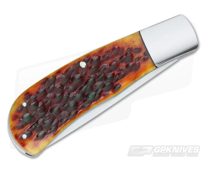 The Handle: A classic amber bone handle has been accented with subdued black fiber liners all pinned to brushed stainless liners. The handle scales are very slightly contoured for a palm filling grip. Dovetailed primary bolster of polished stainless steel.