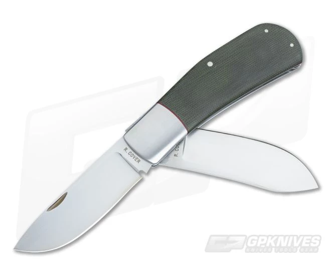 The Ray Cover Sr. Custom Single Blade Hunter is an exceptionally handmade piece that not only offers a handsome traditional aesthetic, but also delivers on superior function. Slip joint folder has two hand-rubbed 154CM stainless steel blades, hand fitted and pinned OD green canvas micarta handles and dovetailed stainless bolsters. Makes the perfect addition to any collection. Brand new directly from Ray Cover Sr.