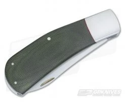 The Handle: A rugged OD green canvas micarta handle has been accented with vibrant red fiber liners all pinned to brushed stainless liners. The handle scales are very slightly contoured for a palm filling grip. Dovetailed primary bolster of brushed stainless steel.