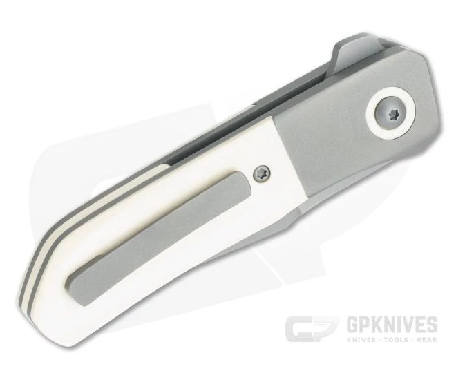 Handle: Clean, simple and ergonomically designed the handle is constructed with beefy, dual gray bead blasted titanium liners supporting blasted titanium bolsters and polished Faux Ivory scales with matching back spacer and pivot collars. This knife exudes style with the handsome, cool faux ivory contrasting nicely with the subdued titanium. One of the beefy liners forms the locking mechanism and delivers smooth operation and solid lock up.