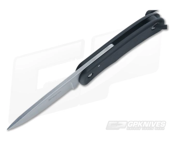 The Handle:Â Two slabs of lightly textured Black G-10 are grooved, contoured and comfortable. There are no liners or locking mechanisms of any kind. Just a simple cutting tool design. It does have a stop pin for the lever, lanyard hole and attached black lanyard with brass bullet casing bead.