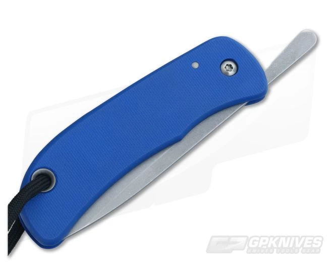 The Handle: Two slabs of lightly textured Blue G-10 are grooved, contoured and comfortable. There are no liners or locking mechanisms of any kind. Just a simple cutting tool design. It does have a stop pin for the lever, lanyard hole and attached black lanyard with brass bullet casing bead.