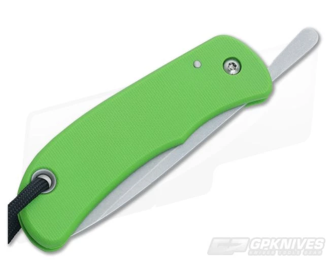 The Handle:Â Two slabs of lightly textured Neon Green G-10 are grooved, contoured and comfortable. There are no liners or locking mechanisms of any kind. Just a simple cutting tool design. It does have a stop pin for the lever, lanyard hole and attached black lanyard with brass bullet casing bead.