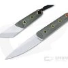 Handle: Both knives feature canvas Micarta handle scales attached over contrasting liners with hollow brass pins with a larger copper pin at the pommel for lanyard attachment. Each symmetrical handle tapers toward the pommel allowing for multiple grips while fitting securely in the hand. Concave transitions from handle to blade allow for a comfortable place for the thumb for added control. Signed on the spine.
