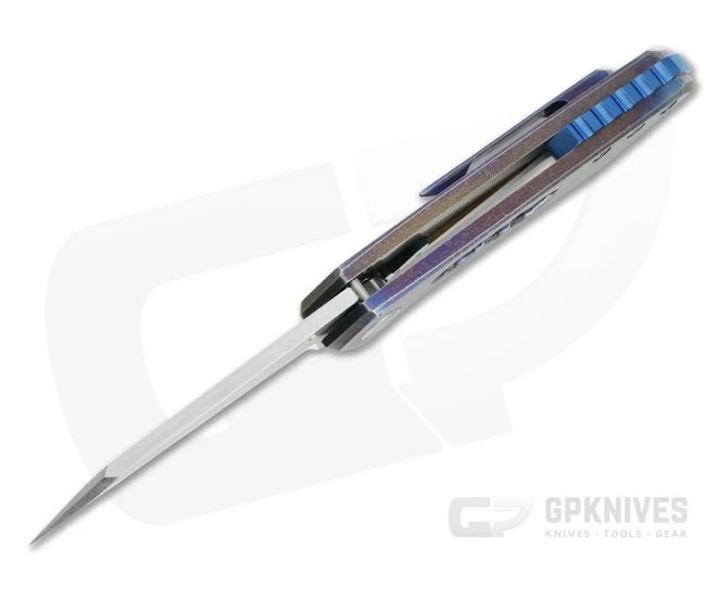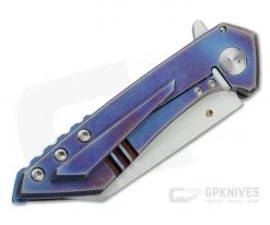 Handle: Anodized custom finished slabs of thick 6Al4v titanium create the handle with the exposed jimped back spacer. Chamfered edges provide comfort with a solid, ergonomic design. The D2 tool steel lock face delivers flawlessly smooth operation on the rock solid frame lock, while the reinforced window cutout on the front provides added style. Includes signed, embossed certificate of authenticity and Pelican 1030 waterproof case for storage.