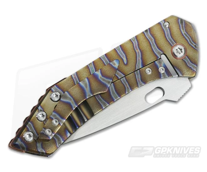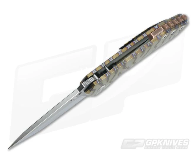 Handle: Â Built of two thick slabs of 6Al4v titanium, both the front and back of the handle are finished in an Orange Peel textured and then flame anodized for a unique, multi color finish. Chamfered edges and an ergonomic design combine for a comfortable and secure in-hand feel. The titanium frame lock is equipped with a hardened D2 tool steel insert that provides smooth and reliable lock operation and does double duty as an over travel stop. A matching milled and flame anodized titanium pocket clip, milled Copper backspacer, titanium hardware and rear copper pivot collar complete this piece. Â