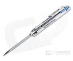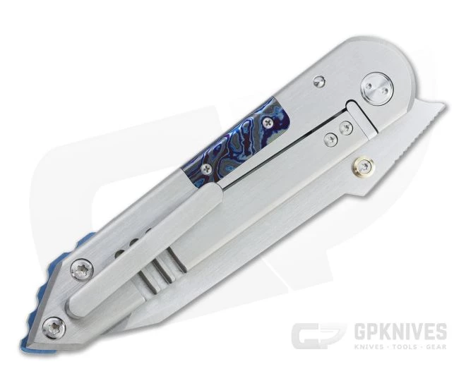 Handle: Dual slabs of titanium and a jimped knocker back spacer form the handle with chamfered edges for comfort and a handsome hand rubbed satin finish. The handle has plenty of real estate for large hands and comes equipped with visually appealing black Timascus inlays for added style. A hardened D2 tool steel lock face and ceramic detent give the integral frame lock smooth, reliable operation with rock solid lock up. Sergey engraves his signature and serial number inside the back spacer.