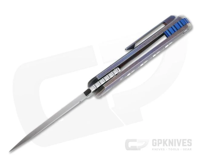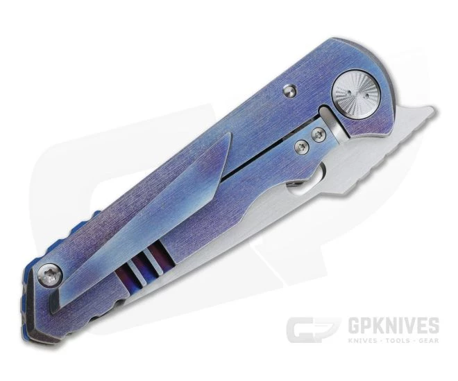 Handle: Built of two thick, contoured slabs of 6Al4v titanium, both the front and back of the handle are brushed satin matching the blade with an anodized finish. Contoured edges and an ergonomic design combine for a comfortable and secure in-hand feel. Milled with four holes for traction and weight reduction, the front scale is backed by a steel mesh for a custom look and feel. The titanium frame lock is equipped with a hardened D2 tool steel insert that provides smooth and reliable lock operation as well as being an over travel stop. A milled titanium back spacer is anodized blue for a pop of color. A custom pivot is textured for a unique look while the remaining hardware is satin finished.