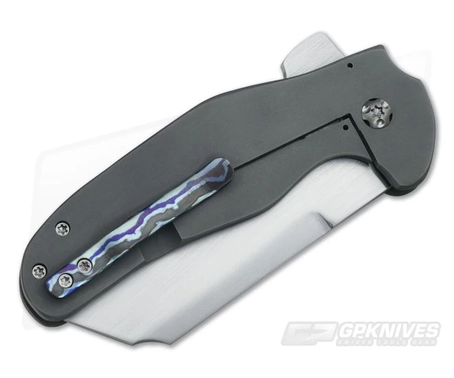 The Handle:Â Full titanium frame design here with frame lock creating a sleek design. All the Ti has been bead-blasted complimenting the carbon fiber onlays and black TiMascus well. It has open barrel spacers construction and a tip up single position pocket clip. The curvy ergo’s of the frame rest quite comfortably in the palm.Â