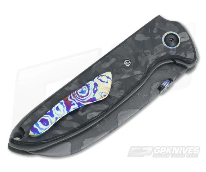 The Handle: Full titanium liner construction here with one forming the lock creating a sleek design. All the Ti has a dark grey media blast look to it complimenting the carbon fiber onlays and single TiMascus onlay well. It has a small TiMascus back spacer, pivot collar and tip up single position pocket clip. The curvy ergo’s of the frame rest quite comfortably in the palm.
