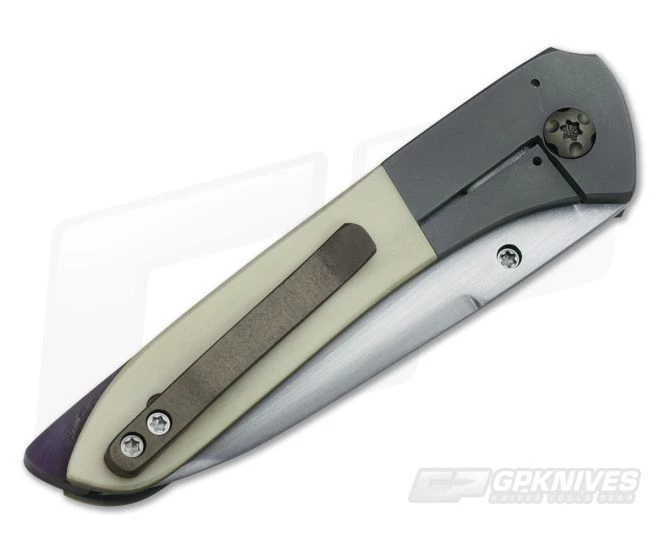 The Handle: Full titanium frame design here with a bolster lock creating a sleek design. All the Ti is matte grey bead blasted complimenting the micarta onlays well. It has an extended bronzed Ti back spacer and a tip up single position pocket clip. The curvy ergo’s of the frame rest quite comfortably in the palm.