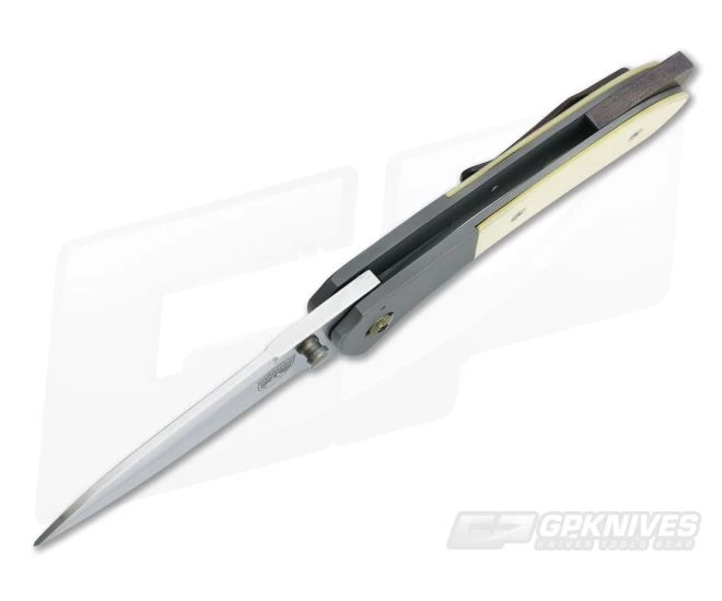 The Blade: Chris chose the unique AEB-L stainless steel for this spear point construction. AEB-L is like a stainless 52100. It is known for its ability to take a very fine edge (originally developed for razor blades) with an extreme high level of corrosion resistance. Its primary carbides are very large giving it excellent toughness, edge retention and ease of sharpening. Chris hand rubbed this one and gave the edge a mirror polishing for a super clean look. It operates via a single bronze thumb stud and smooth ball bearings pivot system.