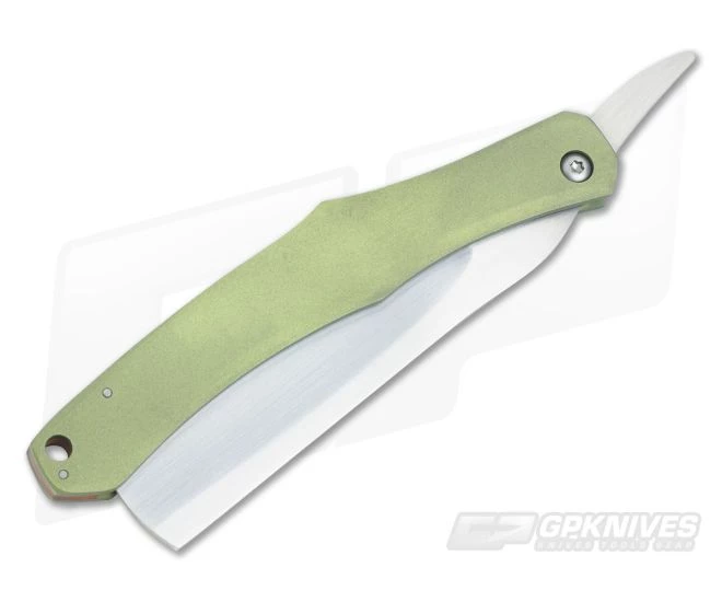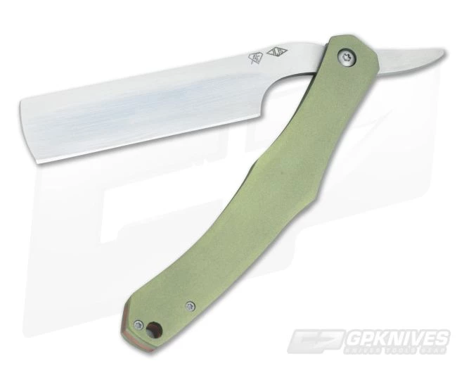 The Handle: Aaron chose titanium construction for the handle, bead-blasted it then anodized it green. He kept some very nice handle ergonomics of bends and contours found on many traditional straight razors. Torx hardware with a copper backspacer round out construction on this classic revival.